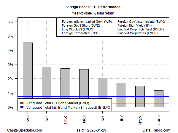 Diversifikavimas į užsienio obligacijų rinkas buvo sėkmingas JAV investuotojų sandoris 2026 m. atidarymo mėnesį. Naudojant ETF rinkinį rezultatams stebėti, šiais metais išryškėja plačiai paplitęs JAV obligacijų našumas, pagrįstas grąža per vakarykštį uždarymą (sausio 29 d.).
